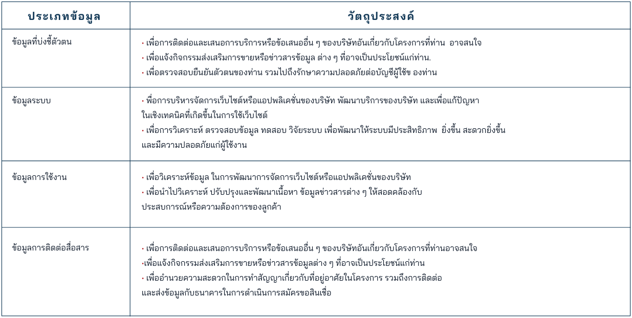 ข้อมูลส่วนบุคคลที่บริษัทได้รวบรวมมาจะถูกใช้ภายในขอบเขตวัคถุประสงค์และเท่าที่จำเป็นแก่การดำเนินการอันเป็นประโยชน์แก่ บริษัท เพื่อให้บริษัทสามารถจัดให้มีการบริการที่ดีขึ้น รวดเร็วขึ้น สะดวกขึ้น และมีประสิทธิภาพมากขึ้น ควบคู่ไปกับความปลอดภัย และความเป็นส่วนตัวของท่านเมื่อได้ใช้บริการ และ/หรือเข้าสู่แพลตฟอรม์ ดังนี้ บริษัทจึงได้สรุปวัตถุประสงค์การใช้ข้อมูลโดยแยก ตามประเภทของข้อมูลดังต่อไปนี้